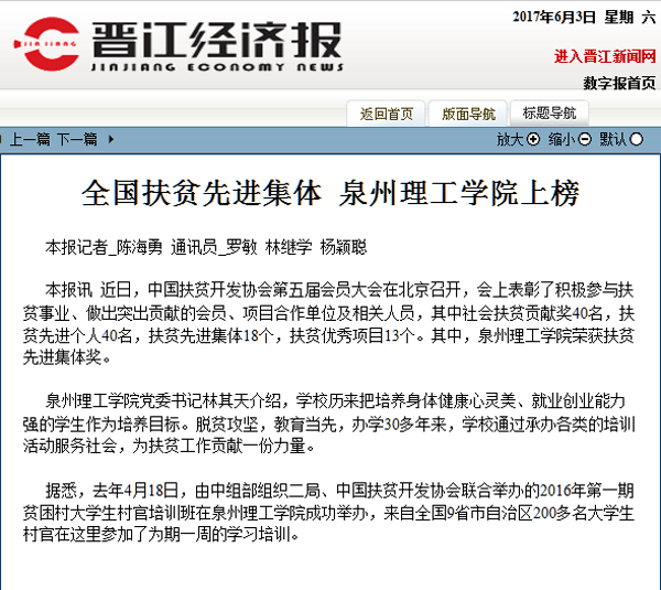 • 【晋江经济报】全国扶贫先进集体 泉州理工学院上榜