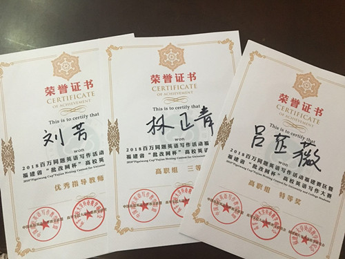 我校在2018百万同题英语写作活动福建赛区暨福建省“批改网杯”高校英语写作大赛取得佳绩: 16商务英语吕芷薇,获高职组特等奖,指导老师刘芳; 16商务英语林正青,获高职组三等奖,指导老师刘芳。 刘芳获 “优...