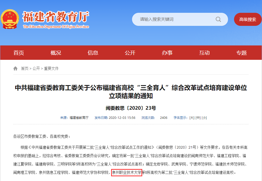 日前,福建省委教育工委发布《关于公布高校“三全育人”综合改革第一批试点总结评估和第二批试点培育建设高校中期考核结果的通知》。泉州职业技术大学等6所高校列入第二批“三全育人”综合改革试点高校。 我校始终坚...