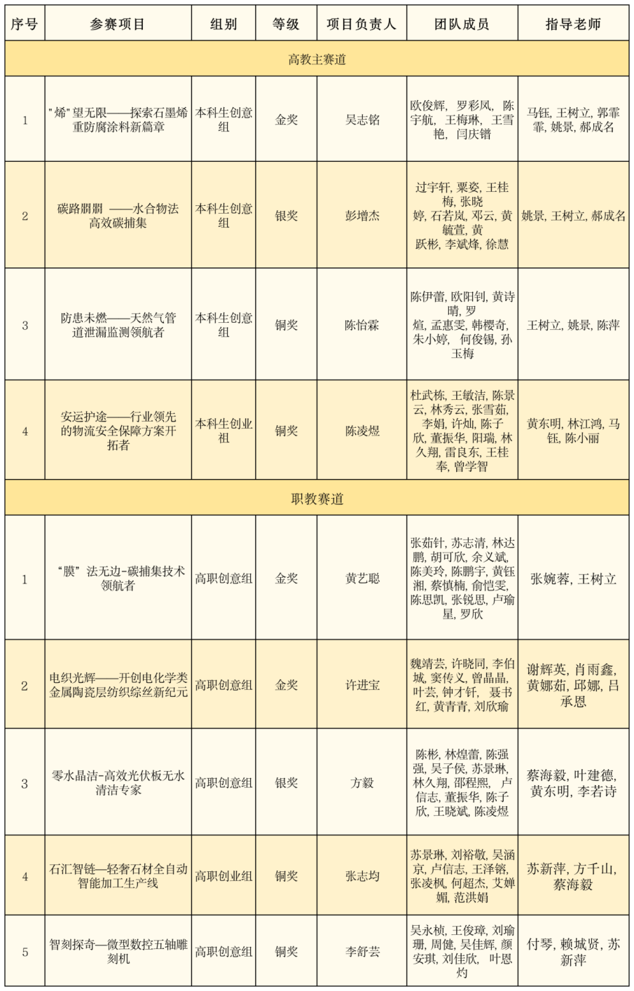 据悉,福建省大学生创新大赛(2024)由福建省教育厅、省委统战部、省委网信办、省发展改革委、省工信厅等12个部门共同主办。大赛围绕“我敢闯、我会创”为主题,包含高教主赛道、“青年红色筑梦之旅”赛道、职教赛道、萌芽赛道、产业命题赛道,共吸引来自全省253所学校近百万名师生报名参赛,累计收到近28.1万个参赛项目。本届大赛自启动以来,校领导高度重视,副校长张建军、校长助理兼教务处处长苏康敏多次现场指导比赛准备工作。在各二级学院广泛宣传和积极动员下,我校共有5050个项目报名参加比赛,同比去年(2205个项目)上涨129.02%,其中职教赛道报名3500项,高教主赛道报名1500项,红旅赛道报名50项,总报名数量创新高,师生参赛热情高涨。下面一起来看看获奖名单吧: