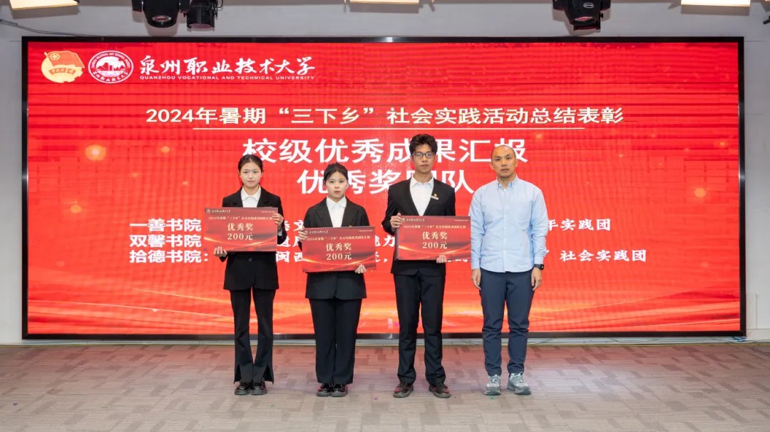 本次暑假社会实践共评选出校级“先进个人”50名、优秀工作者14名、优秀心得4篇、优秀调研报告12篇、优秀团队12支、优秀组织单位3个,并表彰我校在省教育工委主办的“追寻领袖足迹 体悟伟大变革”2024年全省大学生暑期社会实践活动优秀实践团队3支、优秀实践个人1名、优秀实践成果1项。