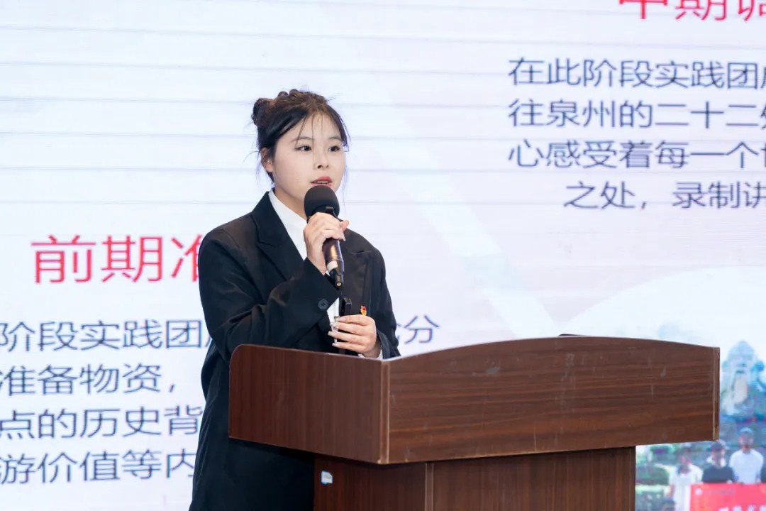 12支校级优秀实践团队依次上台,结合各自专业特色与实践经历分享了丰富多彩的社会实践成果,展示了泉大师生的时代担当与蓬勃朝气。