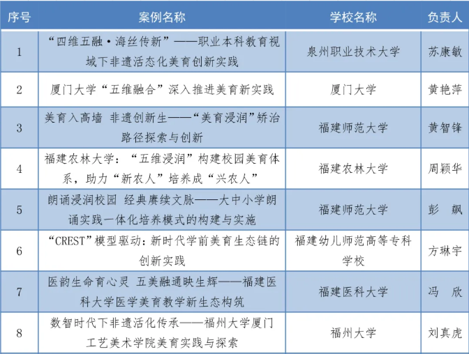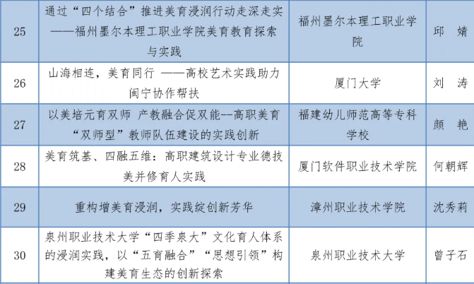 福建省教育厅办公室公布《2025年福建省学校美育浸润行动优秀案例名单》,我校《“四维五融·海丝传新”——职业本科教育视域下非遗活态化美育创新实践》(负责人:苏康敏)、《泉州职业技术大学“四季泉大”文化育人体系的浸润实践,以“五育融合”“思想引领”构建美育生态的创新探索》(负责人:曾子石)两个案例成功入选。