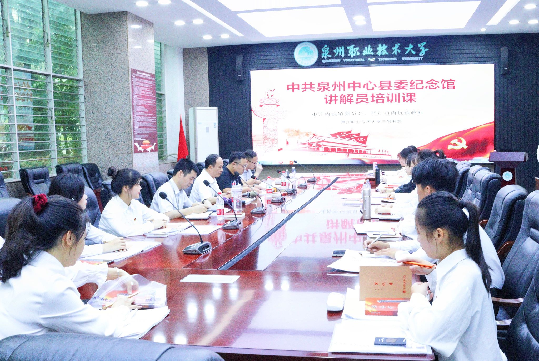组建中共泉州中心县委历史纪念馆讲解团。书院党总支与地方政府共建中共泉州中心县委历史纪念馆讲解团。该团队自2021年成立以来,经过系统培训,每年承担中共泉州中心县委历史纪念馆志愿讲解服务。每年的团队成员需要反复熟读《烽火内坑》《中共泉州中心县委历史纪念馆预览图》等书籍,熟悉了解纪念馆每一件文物、每一张展图背后的故事和来历,深入了解革命英雄的感人事迹,掌握讲解的内容和技巧。同时,学习《讲解员礼仪》《讲解员语言》《展馆讲解注意事项》《讲解员讲解技巧》等课程,取得较好成效。如2021年团队成员12人,在46天的志愿服务讲解中,共接待了55个单位(部门),共计2482位参观者,得到参观者的肯定。在平时,讲解团同学还为学校师生讲解地方革命斗争历史故事和革命先辈的先进事迹,相关做法曾被学习强国、福建日报、新福建、晋江经济报等媒体报道。