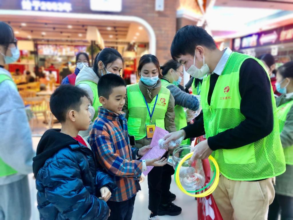▲2023年12月,在福建省晋江市民政局的指导下,晋江市益心社工服务中心、晋江市向阳青少年社工事务所联合泉州职业技术大学志愿者队伍共同开展“四帮四扶”多对一助学活动。图为社工组织帮扶对象与志愿者一起做破冰游戏。