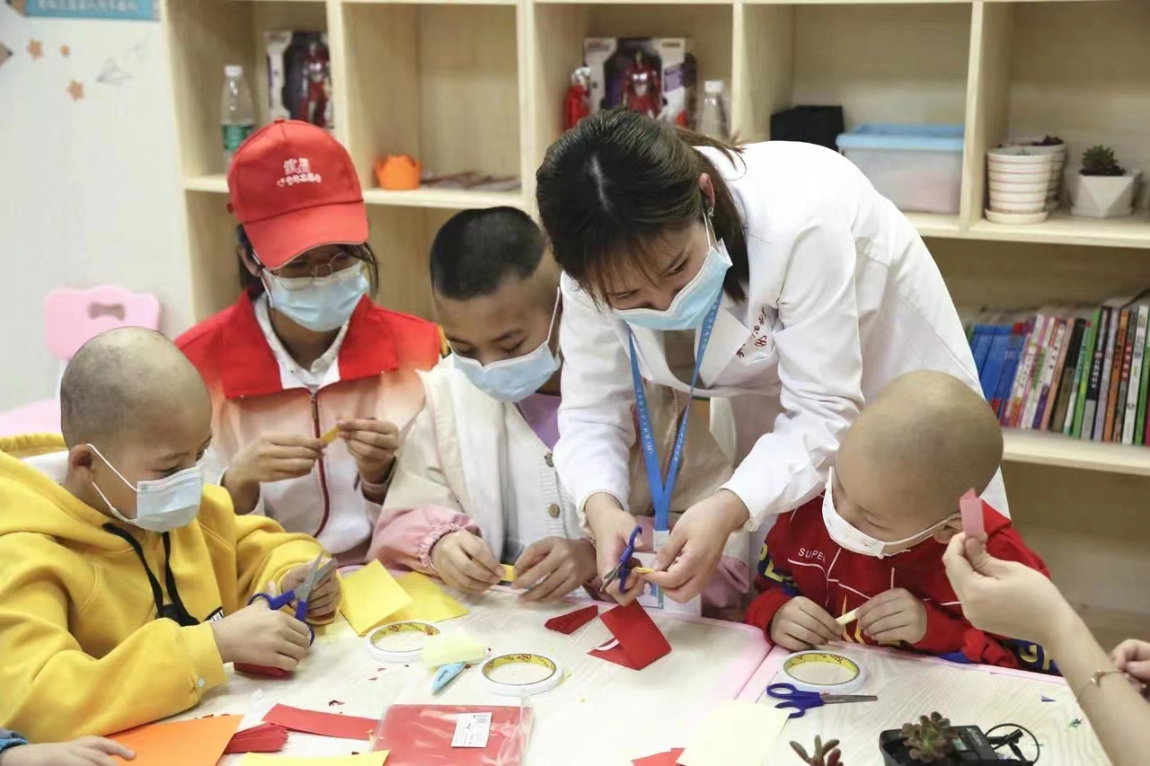 ▲2021年4月13日,武汉大学中南医院医务部社工携手华中师范大学社会工作协会的志愿者在儿童小屋开展“把春天搬进病房”主题活动,通过丰富有趣的活动让儿童体会春天的含义,让正在接受放化疗治疗的肿瘤患儿在病房也能感受春天的气息