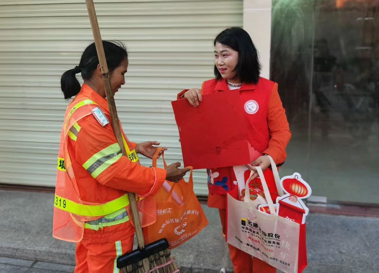▲2021年12月25日,广东省深圳市龙岗区正阳社会工作服务中心驻梧桐山社区党群服务中心社工联动社区志愿者开展“情暖冬日,关爱环卫工人”活动。社工和志愿者走上街头,为环卫工人送上元旦温暖礼包。