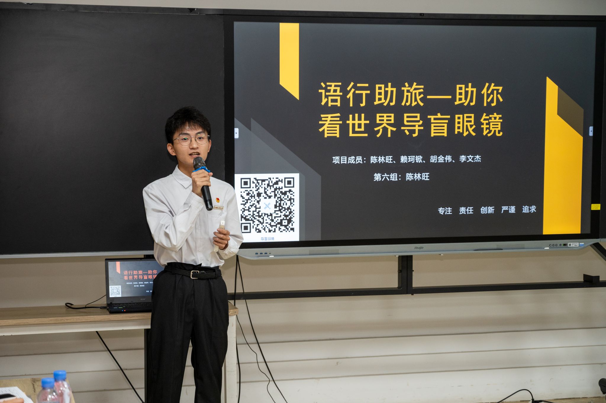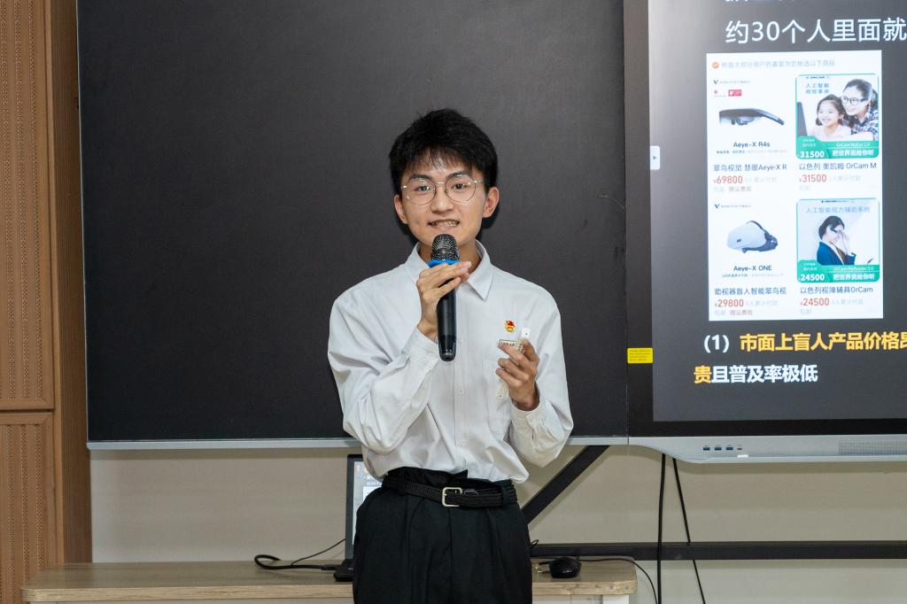 ▲ 陈林旺在大学生知识产权创新创业项目的专利项目打磨活动中进行导盲眼镜的成果展示。